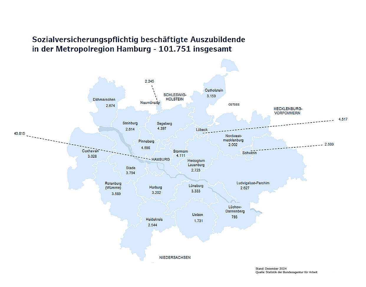 Mit einer stabilen Zahl an Jugendlichen im ausbildungsrelevanten Alter zeigt sich, dass die Region weiterhin ein attraktiver Standort für Ausbildung und Berufseinstieg ist. Im Ausbildungsjahr 2024/25 wurden 30.269 Berufsausbildungsstellen gemeldet, dem standen 26.455 Bewerberinnen und Bewerber gegenüber. Nach der Hansestadt Hamburg hält der Kreis Pinneberg mit 4.598 Stellen die meisten Ausbildungsplätze vor.