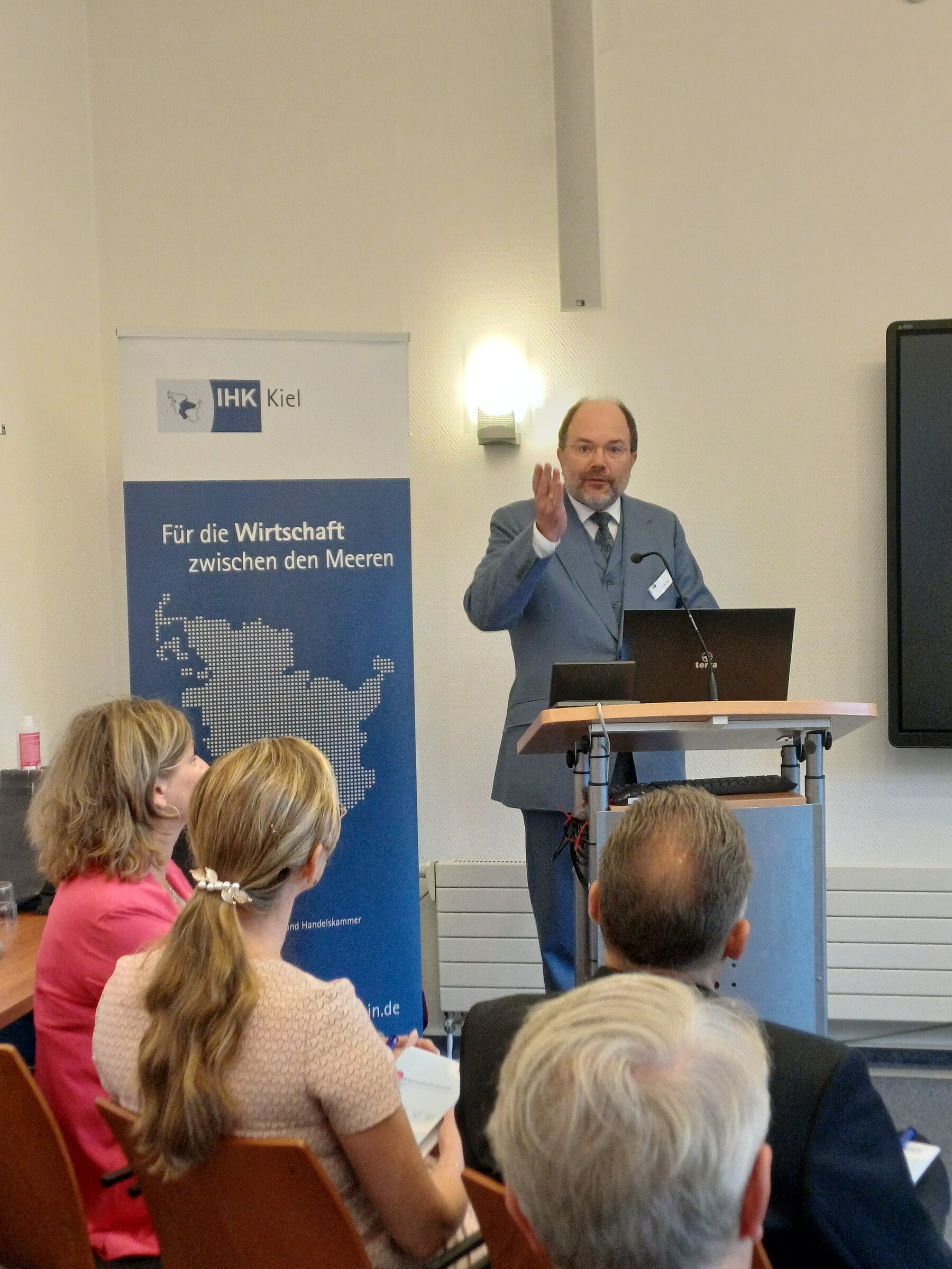 Gebannt und zugleich - wie manch ein Teilnehmer meinte - mit unwohlen Gefühlen – folgte das Auditorium den Ausführungen von Referent und Fregattenkapitän Frank Martin. In seinem Impulsvortrag berichtete er als Leiter der Informationsarbeit und Sprecher der Bundeswehr in Schleswig-Holstein über die aktuellen Bedrohungen für unser Land. Daraus schlussfolgerte er, welche sichtbaren und versteckten Gefahren darin für die Sicherheit auch von Unternehmen stecken, zum Beispiel für Wirtschaftsspionage oder Sabotage.