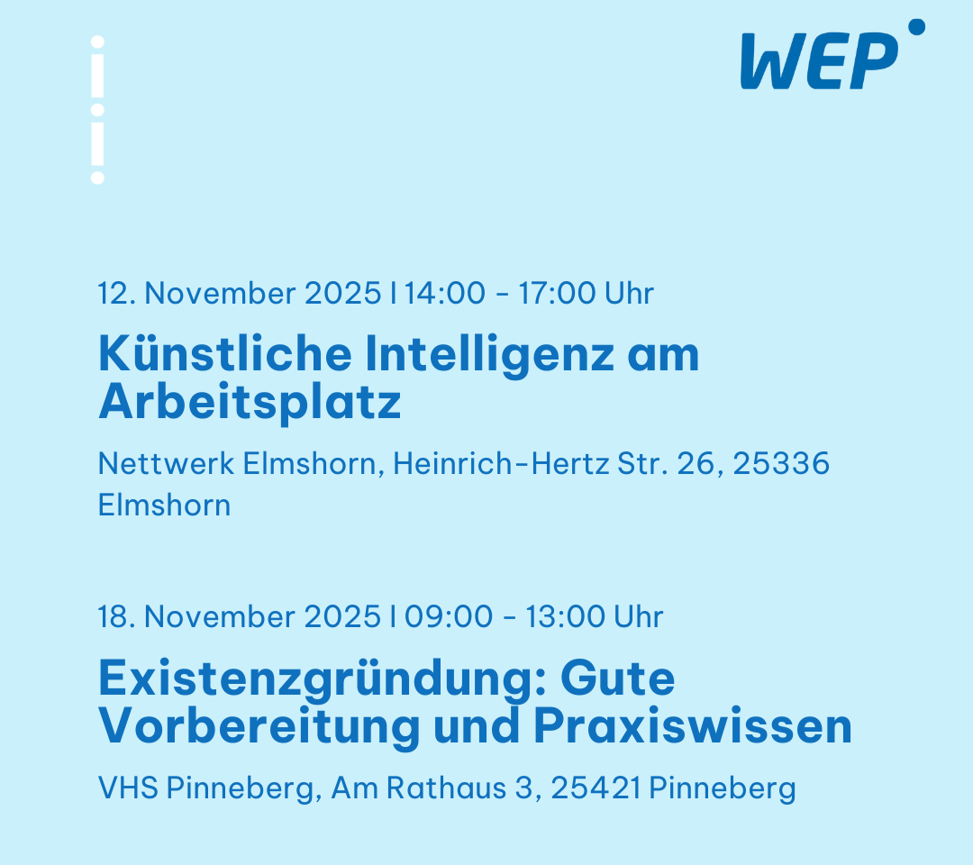 Im November bietet die WEP zwei kostenlose Veranstaltungen zu vielgefragten Themen an, zu denen sich kleine und mittlere Unternehmen sowie Existenzgründer anmelden können. Die Teilnehmerzahl ist begrenzt, noch sind wenige Plätze frei.